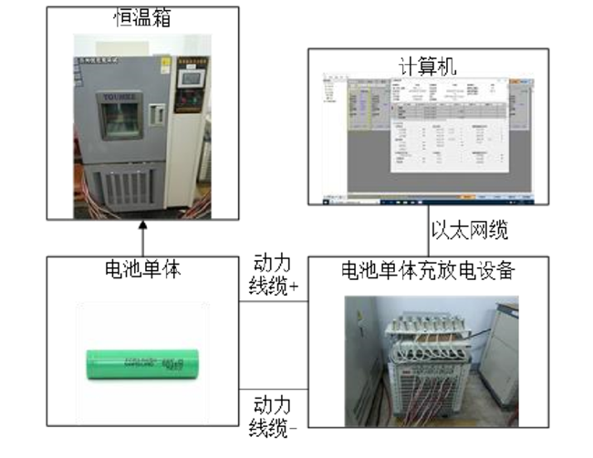 电池的实验数据是建立等效电路模型和参数辨识的基础,也能让我们得到电池工作时的特性。通过电池充放电测试平台来得到所需要的参数,所做的测试包括三种:恒流充放电测试,复合脉冲功率测试(HPPC)以及美国联邦城市运行工况(FUDS)。本文电池实验用的设备简图如下图 2-2 所示,该测试平台主要包含:动力电池测试平台,恒湿恒温箱,电池单体和计算机。实验数据通过动力电池测试平台获得,本文所使用的电池测试平台电流精度介于-0.05%到0.05%之间,电压精度为同样介于该区间内,通过专门的软件实现复杂的可编程负载控制并记录电池测试结果,为了尽量避免由实验的环境温度和湿度所引起的误差,将电池置入恒温恒湿箱中,保持温度湿度不变。