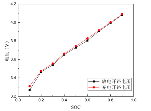 开路电压(OCV)和工作电压是电池建模中的关键的部分。当电池在充放电状态下,电池两端的电势差即为工作电压,又被称作端电压。该电压大小和以下因素有关:负载的多少、负载的频率以及环境温度的高低。电池静置一定时间后,电池内部趋于一种较为稳定的状态,此时对电池两端的电压进行采样,得到的电压就为开路电压。不同SOC对应不同的开路电压,如图2-3为充电时候的OCV与SOC之间的关系曲线与放电时的OCV和SOC间的关系曲线,可以发现,两个曲线在外观大致一致,电压都随着SOC的增大而增大,但是在同一个SOC点的充电开路电压则不同于放电开路电压,放电开路电压一般比充电开路电压要低一些,这是由于两极的极化效应和电池内阻的存在,使电池在充放电过程中锂离子的迁移率和扩散速率发生改变。另外,温度越高,开路电压就越大,这是因为高温会使锂离子活性增加,从而导致电压的增大。