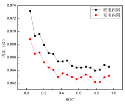 一般来说,动力电池的内阻可以被分为极化内阻和欧姆内阻,前者是由电池正负极极化所产生的内阻,该内阻又可以被分为电化学极化、浓差极化和电阻极化,后者主要由锂离子与电池材料及结构的接触产生[15]。由于激励的作用,电流会发生突变,电池的输出电压也会突变,电压的突变受欧姆内阻所影响,这之后输出电压趋于平缓,而这电压趋于稳定的现象由极化内阻产生。如图2-5,当SOC>20%,内阻的变化趋近于零,但当SOC<20%之间的时候,内阻因SOC减少而变大,这是由于电池内部的物质的惰性增强。并且充电和放电的时候,锂离子电池的内阻并不相同,所以在测算的时候需要充分考虑充放电对内阻的影响。