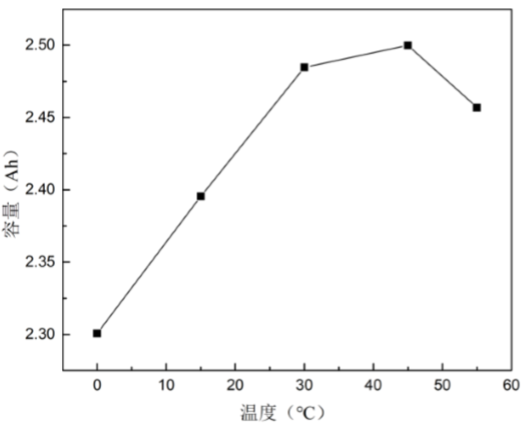 如下图2-6所示,当温度低于45℃的时候,温度越高,电池最大可用容量越大,而温度过高的时候,最大可用容量减少。这是因为温度高会影响锂离子活性,活性越强,电池内部的化学反应的速率加快,而当温度过于高的时候,电池的副反应会剧烈增多,锂离子数量减少,最大可用容量也随之减少。