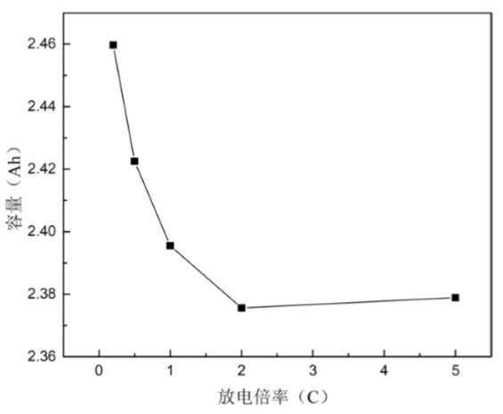 如下图2-7所示,充放电倍率值越大的情况下,电池最大可用容量会变得越小。这是因为充放电倍率增加欧姆内阻形成的电势差下降变大,提早达到截止电压,并且过大倍率的充放电会让锂离子所需的扩散时间变短,使锂离子不能完全得到达电池正极。