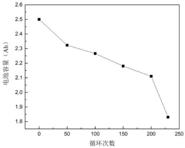 如下图2-8所示,根据实验表明,电池最大可用容量随充放电次数增加而减少,这是由于充放电次数增多,电池的负极会产生一层固体电解质界面膜以及沉淀物,这会显著地减少最大可用容量。