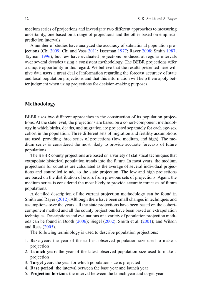 当前投预测方法的详细说明可以在Smith and Rayer (2012)找到。虽然有小的变化,在技术和多年来的假设,所有的预测都是基于cohortcomponent方法和所有县的预测都是基于外推技术。多种群预测方法的描述与评价可以在Booth (2006); Siegel (2002); Smith et al. (2001); and Wilson and Rees (2005)发现。