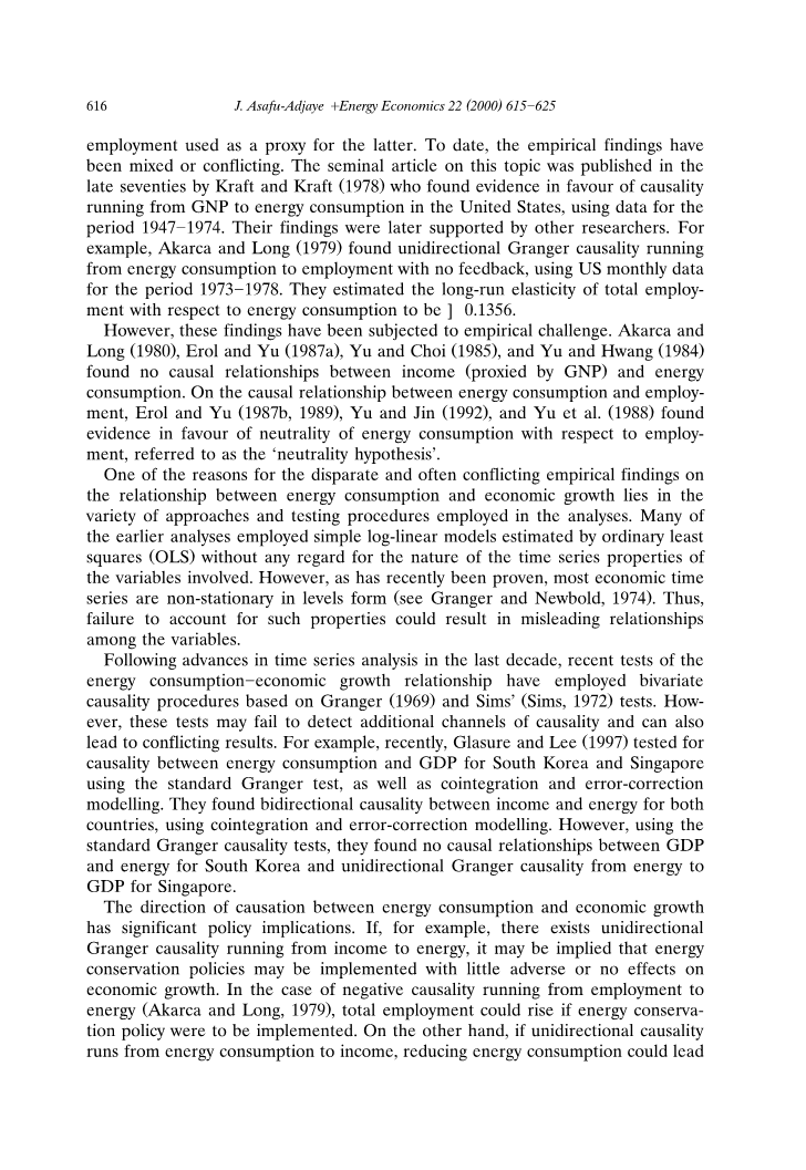 能源消费与经济增长之间的因果关系方向具有重要的政策含义。如果,例如,从收入到能源存在单向的因果关系,这可能意味着节能政策可能实施对经济增长的影响不大。就从就业到能源的负因果关系来说(Akarca和Long,1979年),如果实施节能政策总就业人数可能上升。另一方面,如果单向因果关系从能源消费到收入的进行,降低能耗可能导致收入或就业的下降。在任何一个方向上没有因果关系,所谓的“中立性假说”,(Yu和Jin,1992年),这一发现意味着,节能政策不会影响经济增长。