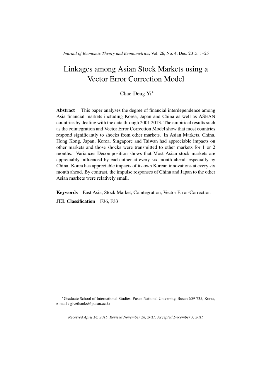关键词:东亚,股票市场,协整检验方法,向量误差修正模型