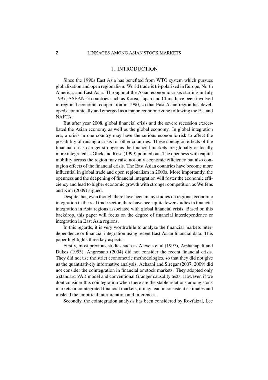 首先,以前的研究,如Alexeis等人(1997),Arshanapali和Dukes(1993),Angresano(2004)没有考虑到最近的金融危机。他们没有使用严格的计量经济学的方法,使他们没有提供定量信息的分析。 Achsani和Siregar(2007,2009)没有考虑经济或股市的协整关系。他们只通过一个标准的VAR模型和传统的Granger因果关系检验。然而,如果我们不考虑这个协整关系时,当金融市场或者股票市场之间存在稳定的协整关系,有可能导致不一致的估计和错误的实证解释和推论。