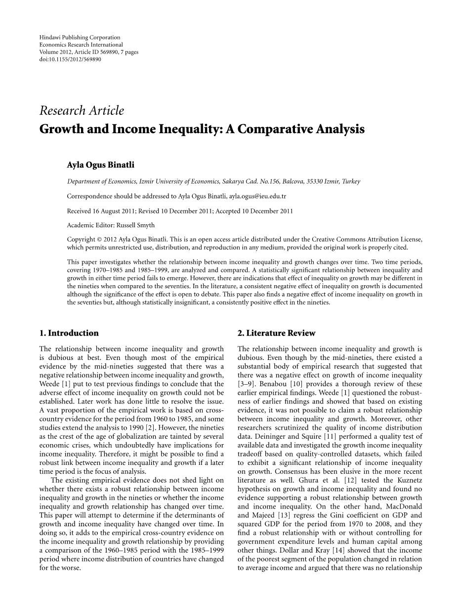 收入不平等与经济增长之间的关系是不确定的。尽管九十年代中期大量的实证研究表明,收入不平等对于经济增长之间存在负面影响。Benabou提供了这些早期实证研究结果的全面回顾。Weede对早期研究结果的稳健性提出了质疑并表示,基于现有的证据,确定收入不平等和经济增长之间的稳健关系是不可能的。此外,其他研究人员也非常关注收入分配数据的质量。Deininger and Squire对可用数据进行了质量检验,并调查了基于质量控制数据集的收入不平等增长权衡,也未能研究出收入差距对经济增长的显著关系。在最近的文献中,共识已经难以实现。Ghura et al.检验了关于收入差距与经济增长的库兹涅茨假说,并没有发现任何证据支持经济增长和收入不平等之间存在强大的关系。另一方面,MacDonald and Majeed将1970年到2008年这一时期有关GDP的基尼系数与GDP的平方值进行了回归分析,他们发现不管是否存在政府支出水平和人力资本的影响,两者都有着不可分割的关系。Dollar and Kray表明,最贫困人群的收入相对于平均收入是变化的,并认为收入差距和经济增长之间没有关系,然而,经济增长影响着穷人的绝对收入。Weisbrot et al.则认为,无论是穷人还是工薪阶层都能利用来自于经济增长的收益。Tabassum and Majeed则通过69个发展中国家的样本数据,阐述了收入不平等可能在短期内有助于增长但从长远来看将阻碍经济增长的观点。