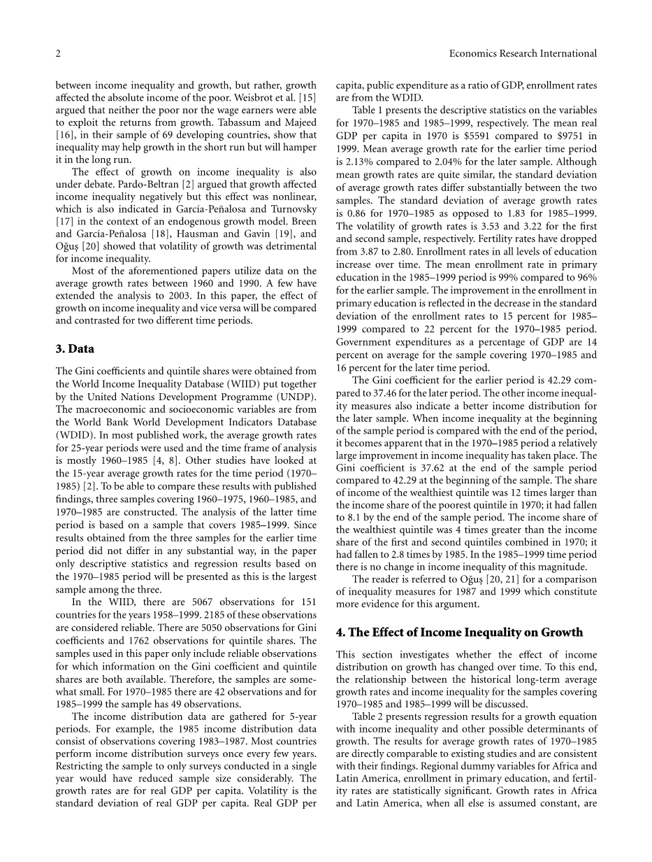 上述论文中大多利用的是1960年和1990年之间的平均增长率数据。其中少数将分析拓展到了2003年。本文将比较经济增长对收入不平等的影响以及收入差距对于经济增长的影响,并从两个不同的时期予以对比。
