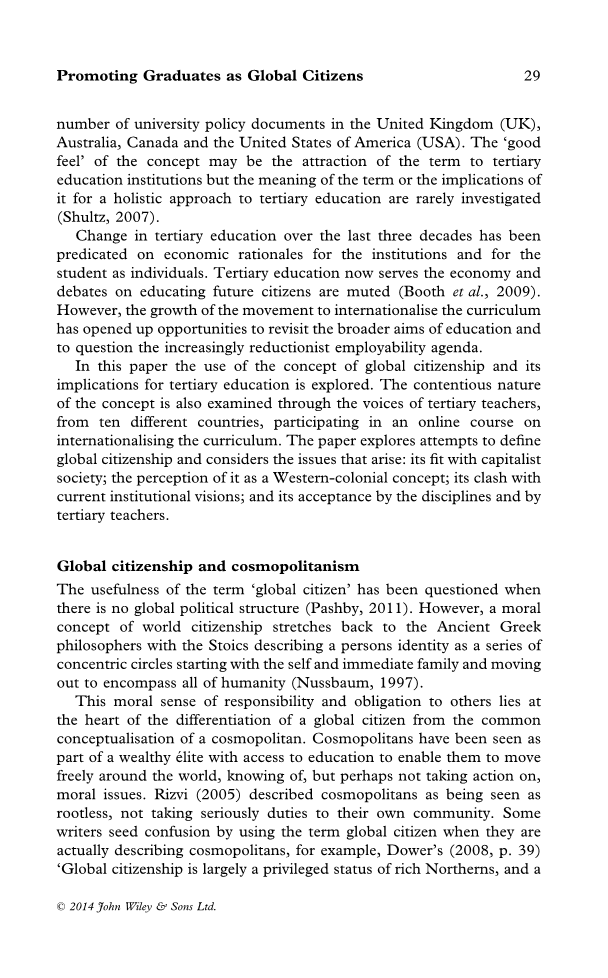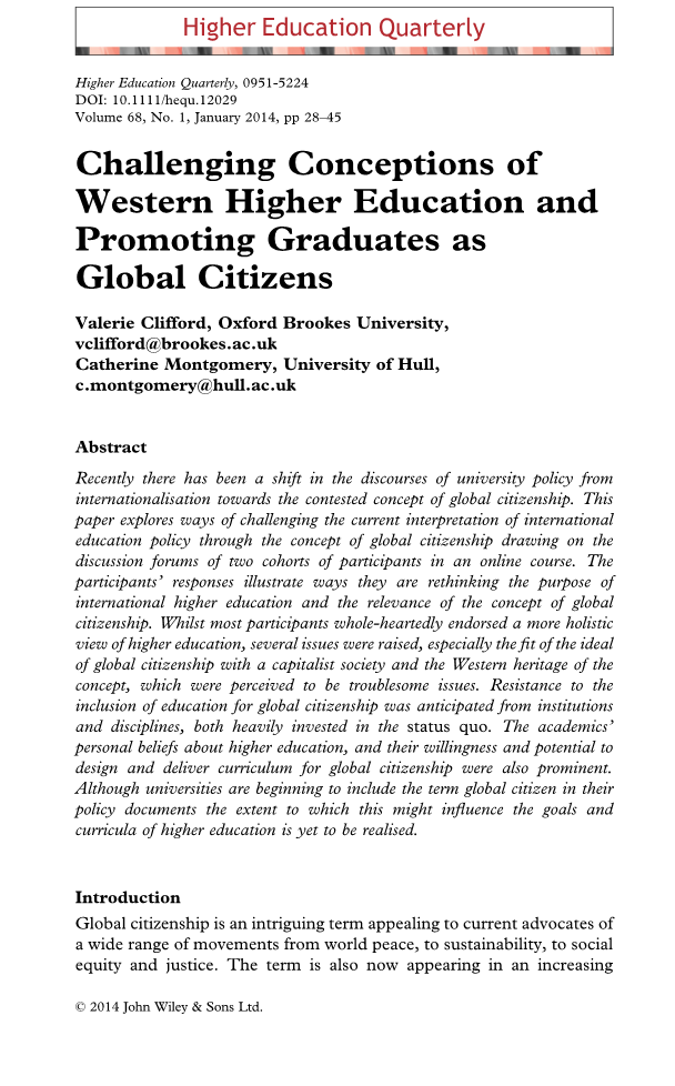 全球公民权是一个有趣的词,它吸引从世界和平到可持续发展,到社会公平和正义等当前广泛运动的倡导者。现在,这个词也越来越多的出现在英国、澳大利亚、加拿大和美国的大学政策文件中。这个概念的“良好的感觉”可能会吸引高等教育机构,但高等教育的整体方法中这个词的含义或意义很少调查(舒尔茨,2007)。