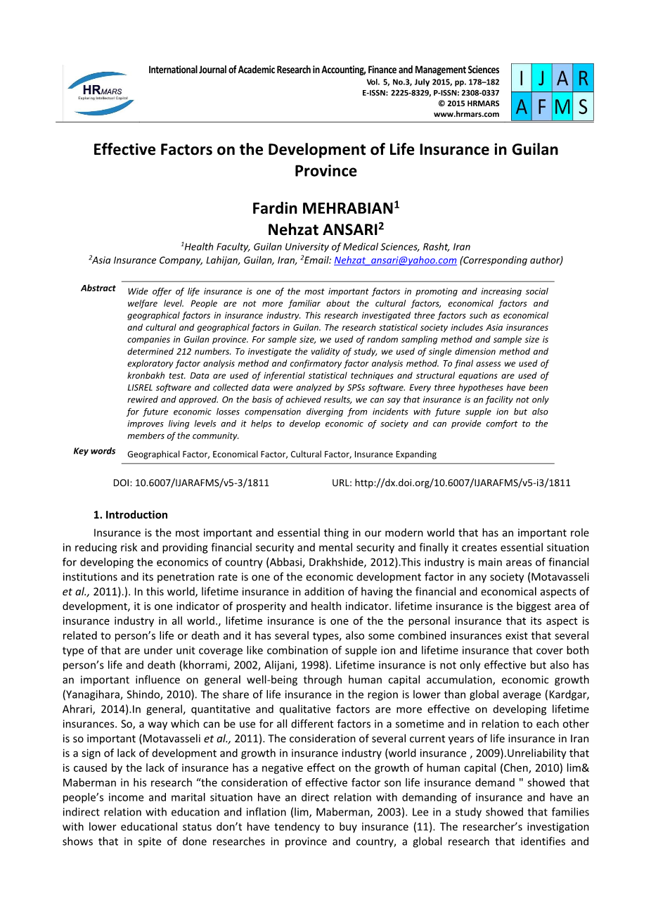 保险公司,拉希詹,Guilan、伊朗、email:nehzat_ansari@yahoo.com(通讯作者)