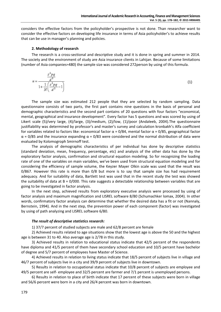 被随机抽样选择的样本量估计为212人。数据问卷由两部分组成,第一部分包含九个问题,其中个人和人口特征为基础,第二部分包含20个具有“经济,精神,地域和保险发展”四个因素的问题。每个因素有5个问题,并使用Likert量表(5)/非常大,(4)/大,(3)/中,(2)/低,(1)/差(Andaleeb,2004)得分。调查问卷合理性是由教授和硕士调查计算kronbakh的阿尔法系数,与以下因素有关的因素:经济因素alpha;= 0/84,心理因素alpha;= 0/85,地理因子alpha;= 0/85和保险扩张alpha; = 0/83,并通过Kolomogroph Smirnoff检验评估数据的正态分布。