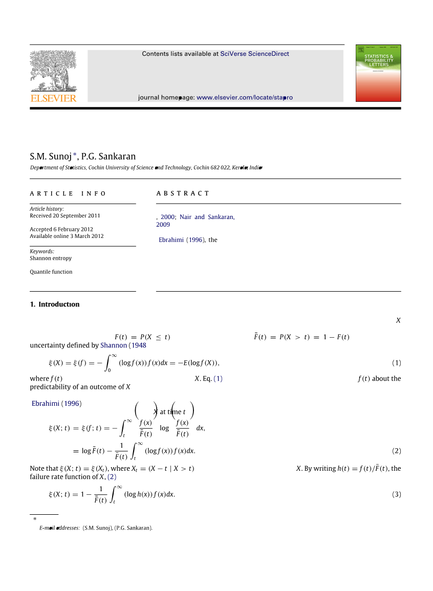 其中为的概率密度函数,等式(1)给出了中包含预期不确定度的的结果的可预测性,即熵测度。在许多领域,如可靠性分析,生存分析,经济学,商业等,研究期间的时间长度一直是我们感兴趣的一个主要变量。在这种情况下,信息测度是时间的函数,因此它们是动态的,在这种想法的基础上,Ebrahimi (1996)中定义了在时间点,变量的熵的残差: