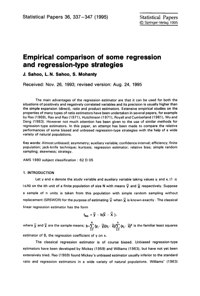 回归估计的主要优点是可以用于正相关和负相关变量的情况,其精度通常高于简单扩展(直接),比率和乘积估计。 在多篇论文中已经对许多类型的比率估计的性质进行了广泛的实证研究,例如Rao (1969), Rao and Rao (1971 ), Hutchinson (1971 ), Royall and Cumberland (1981 ), Wu and Deng (1983)。 然而,对回归型估计量的类似方法的使用没有太多的关注。 在本文中,已经尝试比较一些有偏和无偏的回归型策略在各种自然种群的帮助下的相对表现。