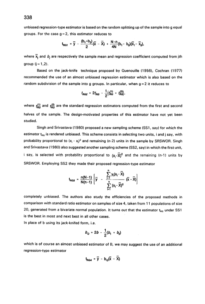 根据Quenouille (1956)提出的杰克刀技术,Cochran (1977)推荐使用几乎无偏差的回归估计量,这也是基于将样品随机分为g组。 特别地,当g = 2时,它减少到