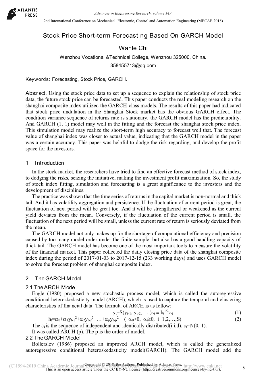 Bollersle在1986年曾提出了一种改进的ARCH模型的方法,并称之为广义自回归条件异方差模型(GARCH模型)。 GARCH模型添加了异方差性本身对ARCH模型的自回归影响。 而GARCH模型可以描述大部分财务回报的时间序列。因此GARCH模型在此之后被广泛应用于股票价格波动的研究之中。 GARCH模型的公式如下: