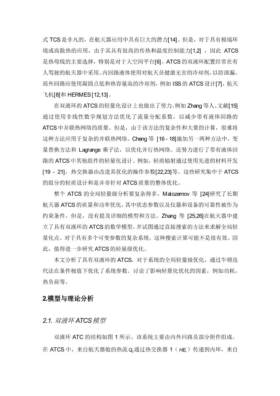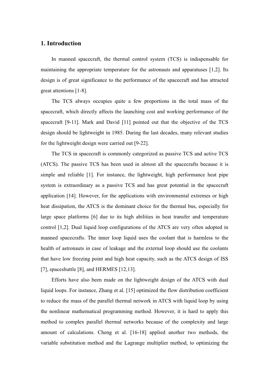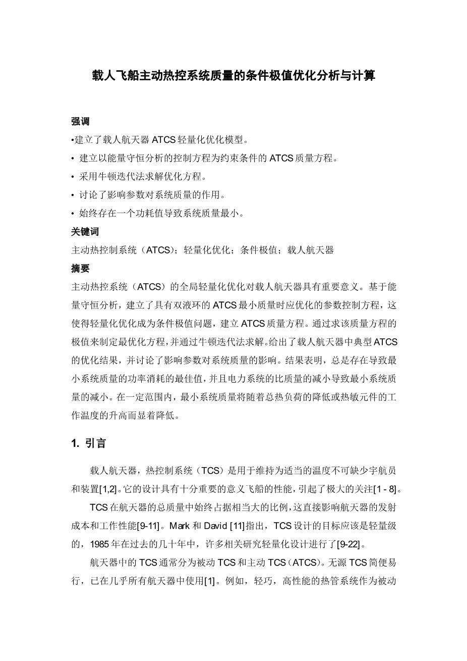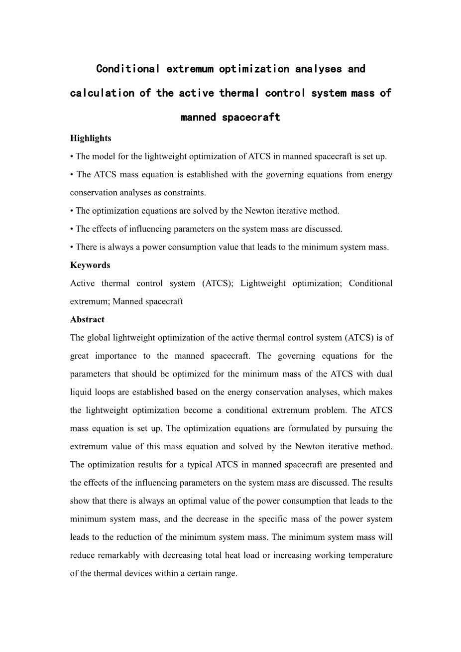 载人飞船主动热控系统质量的条件极值优化分析与计算外文翻译资料