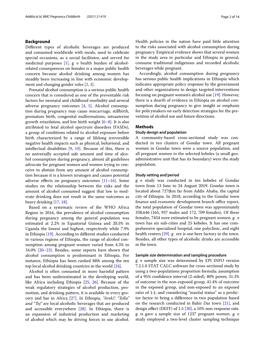 酒精通常以更有害的方式消费,并且在发展中国家被低估,例如非洲,包括埃塞俄比亚[25,26]。由于酒精生产、促销和饮酒模式的监管策略薄弱,非洲的每个杂货店和酒吧都可以买到它[27]。在埃塞俄比亚,“Areki”、“Tella”和“Tej”是当地生产的酒精饮料,随处可得[28]。在埃塞俄比亚,酒精的工业生产和销售正在扩大,这可能是使用酒精的驱动力。国家的卫生政策很少关注与怀孕期间饮酒相关的风险。经验证据表明,特别是研究地区和埃塞俄比亚的一些妇女在怀孕期间饮用传统的土著和有记录的酒精饮料。