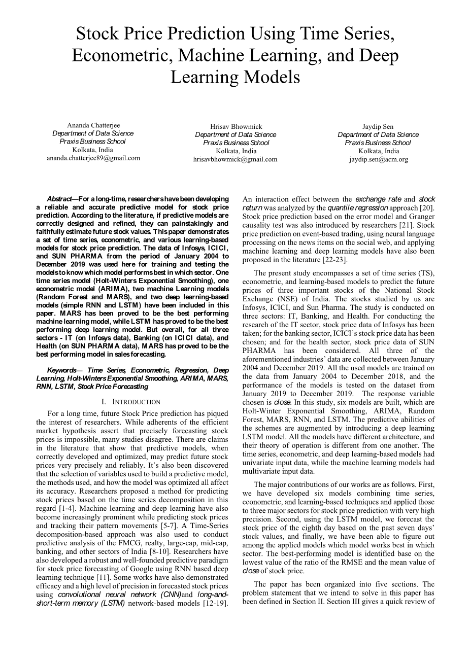 长期以来,研究人员一直致力于开发一种可靠、准确的股价预测模型。依据相关文献,如果对预测模型进行改进,它们可以更加准确的预估未来的股票价格。本文提出了一套基于时间序列、计量经济学和其它相关的股票价格预测模型。使用了Infosys、 ICICI、和 SUN PHARMA这三个股票从2004年1月至2019年12月的数据,对模型进行了测试,以了解哪个模型在哪个领域表现最好。本文包括一个时间序列模型(Holt-Winters 指数平滑)、一个计量经济模型(ARIMA)、两个机器学习模型(随机森林模型和MARS模型)和两个基于深度学习的模型(simple RNN 和 LSTM)。MARS 已经被证实是性能最好的机器学习模型,而 LSTM 被证实是性能最好的深度学习模型。总体而言,对于IT行业(Infosys的数据)