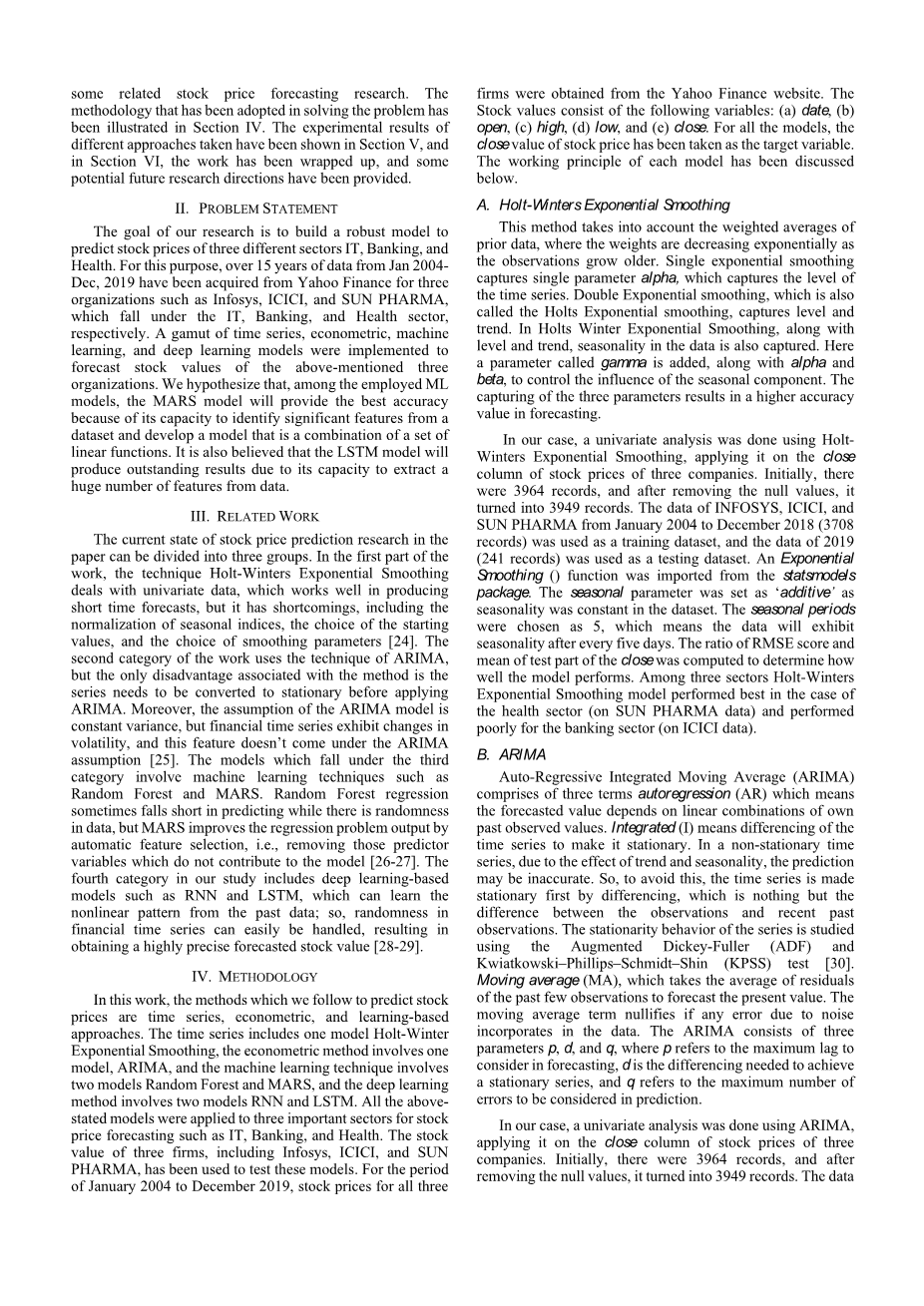 预测未来的价格的三个重要股票,其中这三个股票都来自印度的国家证券交易所(NSE)。我们研究的股票是Infosys、 ICICI、和 SUN PHARMA。这项研究涉及三个部门: IT、银行和医疗业。对 IT 部门的研究,我们获取了 Infosys 的股价数据; 对于银行部门,我们选择了ICICI 的股价数据; 对于医疗业,我们考虑了 SUN PHARMA 的股价数据。上述三个行业收集的数据是从2004年1月至2019年12月。所有模型都会使用2004年1月至2018年12月的数据进行测试,并用2019年1月至2019年12月的数据集对模型的性能进行测试。所选的响应变量是稠密的。在这项研究中,建立了六个模型,分别是 Holt-Winters 指数平滑模型、ARIMA、随机森林模型、MARS、RNN 和 LSTM。通过引入深度学习 LSTM 模型,增强了该方案的预测能力。所有的模型都有不同的结构,它们的运作理论也不同。基于时间序列、计量经济学和深度学习的模型都是单变量输入数据,而机器学习模型则是多变量输入数据。
