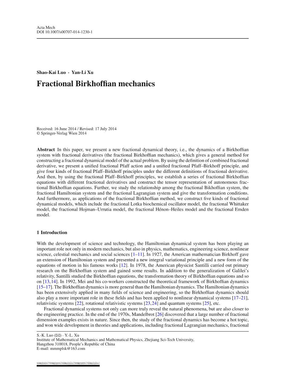 分数阶动力系统不仅能更真实地揭示自然现象,而且更接近于自然现象工程实践。在20世纪70年代末,曼德布罗特[26]发现了大量的分数维的例子存在于自然界。从此,分数阶动力学的研究成为一个热门话题,在分数拉格朗日力学、分数哈密顿力学、分数非完整系统动力学和分数广义哈密顿力学等理论和应用方面取得了广泛的发展力学[27–43],及其应用[44–50]。为了更好的解决分数维问题在科学和工程中,有必要提出Birkhoffian系统的分数阶动力学理论。