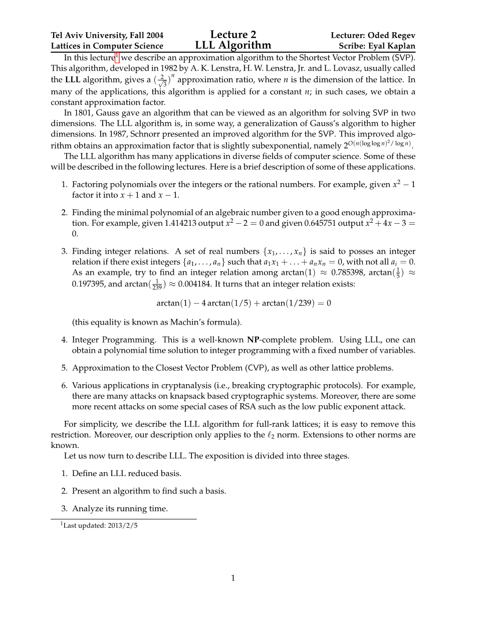 在本次演讲中(1)我们将描述一个关于最短路径算法(SVP)的近似算法。这种算法,由A. K. Lenstra,H.W. Lenstra,Jr.和L. Lovasz于1982年开发,通常被称为LLL算法,给出一个的近似比,其中n是点阵的维数。在许多应用中,该算法适用于常数n,在上诉算法下,就会得到一个常数逼近因子。