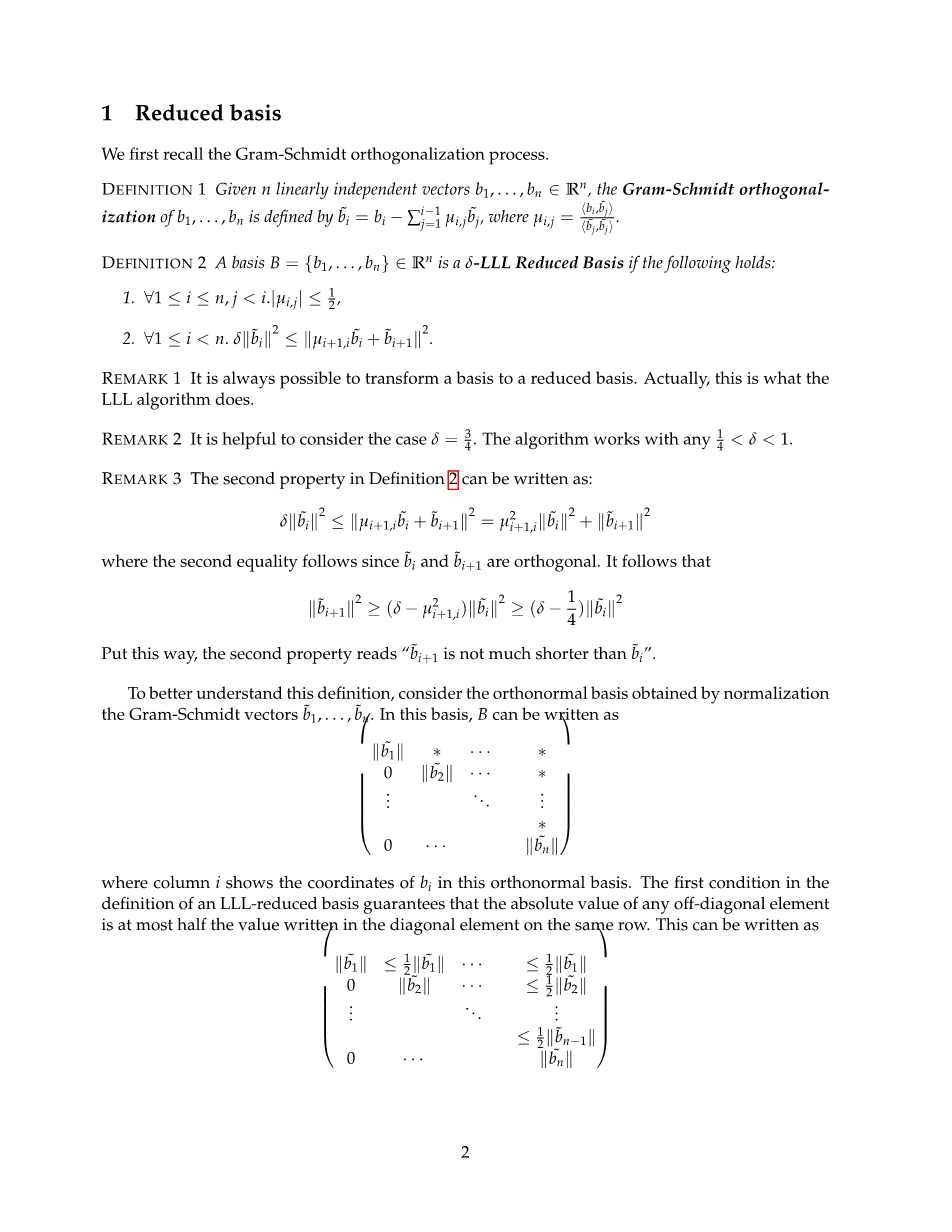 在这里我列双显示在这个标准正交基的坐标。在一个LLL规约基德基础上保证的定义的第一个条件,任何非对角线元素的绝对值至多为写在对角线元素上的同一行中的值的一半。这可以写成