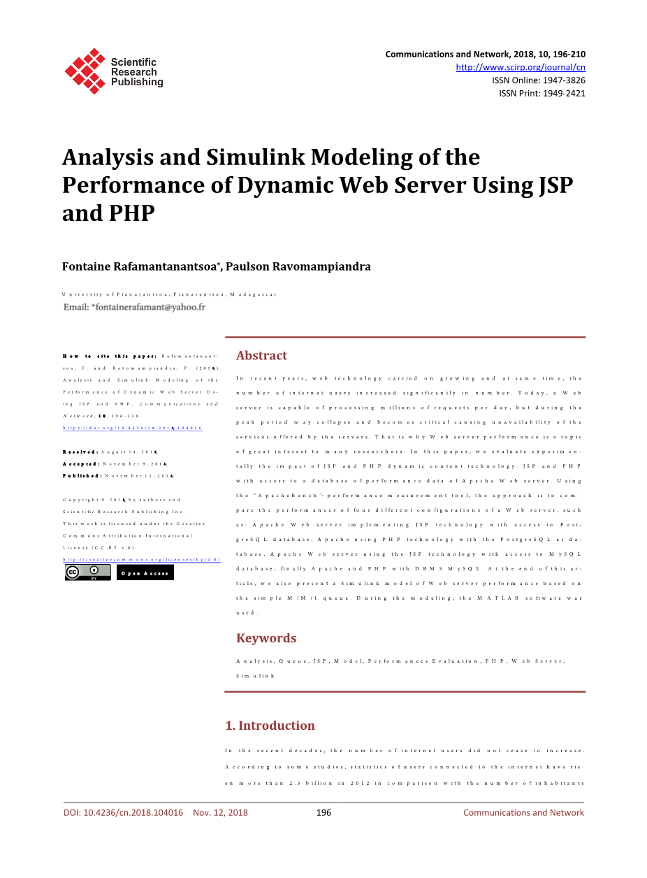 摘要:近年来, 网络技术不断发展, 与此同时网民数量显著增加. 如今, Web服务器每天能够处理数百万个请求, 但在高峰时期可能会崩溃, 并成为导致服务器提供的服务不可用的关键因素. 这就是为什么Web服务器性能是许多研究人员非常感兴趣的话题. 在本文中, 我们通过访问ApacheWeb服务器的性能数据数据库, 对JSP和PHP动态内容技术(JSP和PHP)的影响进行了实验评估. 使用“apachebench”性能度量工具, 比较了Web服务器的四种不同配置的性能, 如:实现JSP技术的Apache Web服务器与PostgreSQL数据库的访问、使用PHP技术的Apache与PostgreSQL数据库的访问、使用JSP技术的Apache Web服务器与WI访问MYSQL数据库, 最后访问apache和PHP与dbms MYSQL. 在本文的最后, 我们还提出了一个基于简单M/M/1队列的Web服务器性能模拟模型. 在建模过程中, 使用了matlab软件.