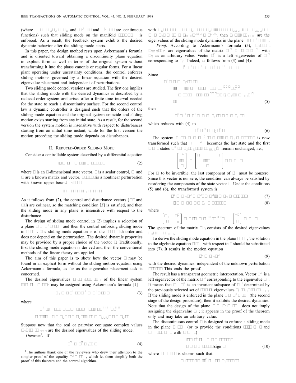 结果有一个显而易见的几何解释。向量是矩阵对应于特征值的一个左特征向量,它意味着动能是先前选定的阶特征值所确定的矩阵的一个不变子空间。如果在平面(设计过程的第二阶段)执行滑模,则可以显示出所需的动态。注意,平面的设计并不意味着赋予特征值,它只出现在定理的证明中,并且可以取任意值。