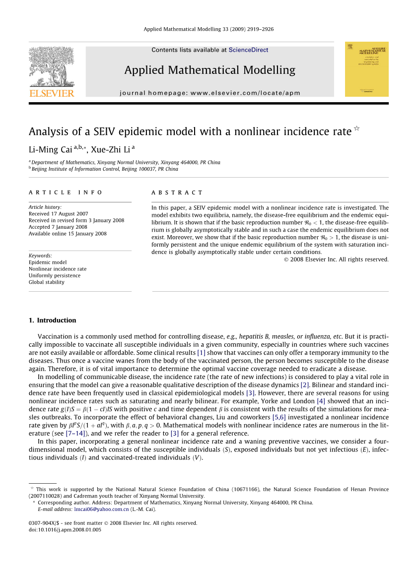 SEIV流行病模型的分析与非线性发生率外文翻译资料