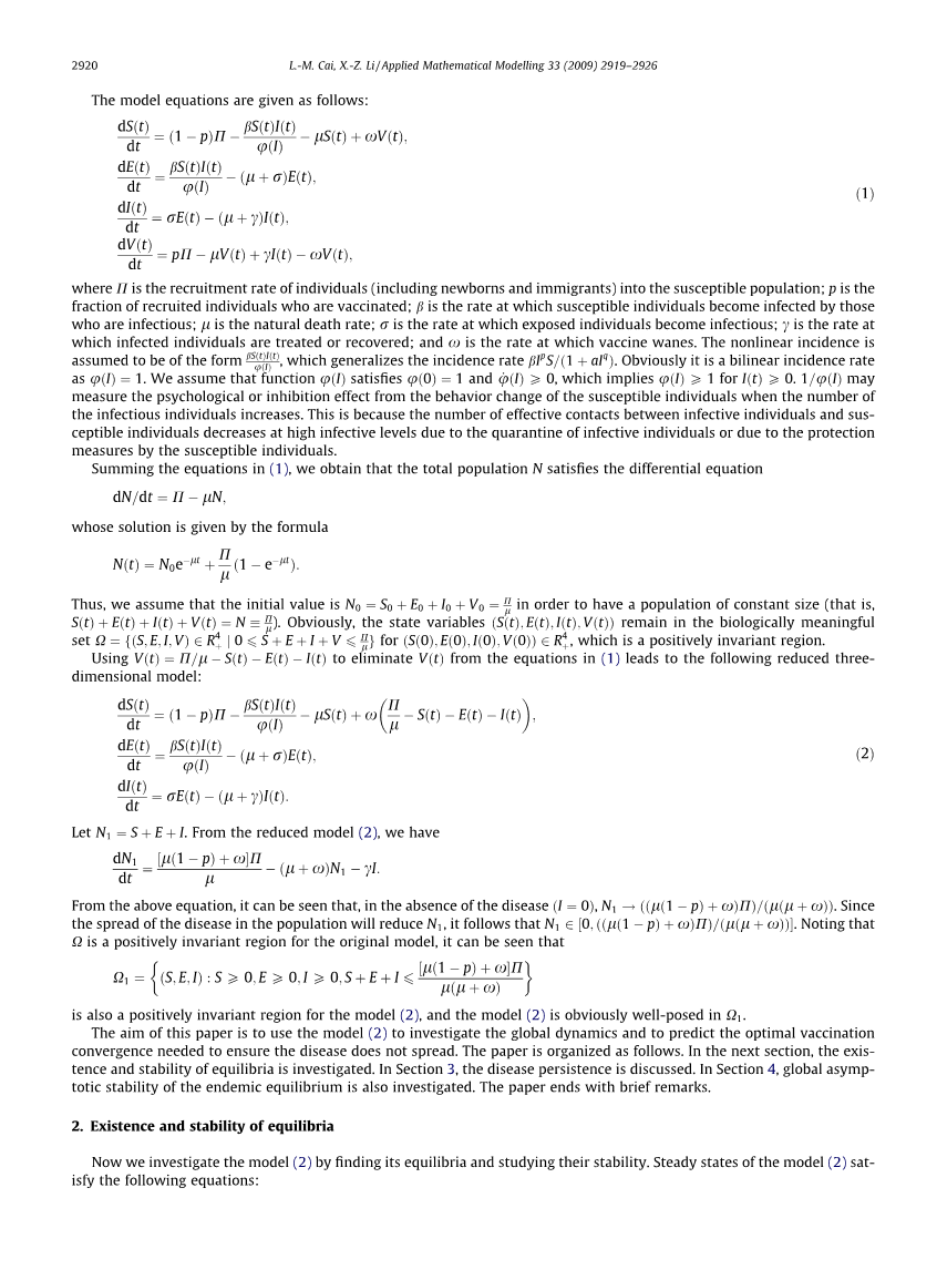 П是易感人群的新增数量(包括新生儿和移民);p是新增的一部分接种疫苗的人群;是易感者成为感染者的速率;是自然死亡率;是无病者称为易感者的速率;是感染者治疗或康复的速率;是疫苗减弱的速率.非线性的发病率假设为,一般发病率为.很明显这个双线性发病率.我们假设函数当增加感染人群的数量同时改变了易感人群的数量,.这是因为感染人群的数量和易感人群之间由于隔离染病者或与易感者有高等级的有效的保护措施.