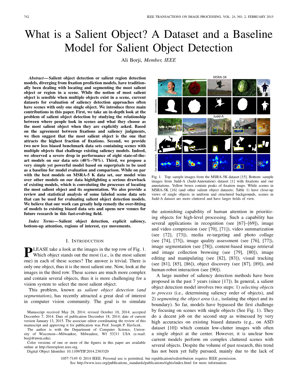 大量的显著性检测方法在过去7年中被提出(从[17])。总的来说,一个显著目标检测模型包含两个步骤:1)选定对象来处理(即决定目标的显著性顺序),2)分割目标区域(即分离目标和它的边界)。目前为止,模型通过集中有单一物体的场景(见图1)而绕过了第一个问题。这些模型对第二个步骤做了适当的工作来证明现有的偏颇数据集(如在ASD数据集[10])上的超高准确度,这些数据集包含中心通常有一个单一物体的低混乱图像。但是,现有模型如何处理有多个物体的复杂混乱图像是不清楚的。不管过去的研究有多少,这个趋向还没有被完全研究,主要因为缺乏两个组分:1)扩大模型和模型开发的适当的基准数据集;2)对最显著目标的广泛一致的客观的定义。这篇文章,我们试图提供解决这些问题的方案。进一步地,我们打算发现哪个部分可能是当移至复杂场景时模型可能出现的失败中的最弱链。