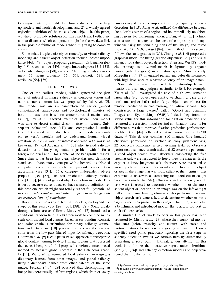 可能与我们的工作最相似的工作是由Li等人[42]发布的。在他们的工作中,他们提供了两大贡献。第一,他们使用来自PASCAL数据集[84]的带注解的图像收集了眼运动数据集,并称他们的数据集为PASCAL-S。第二,他们提出了一个胜过这个数据集(也是四个其他基准数据集)上的其他最新的显著目标检测模型的模型。他们的模型将显著目标检测问题分成两个过程:1)分割产生过程;2)使用定位预测的显著性得分机制。这里,同Li等人相似,我们也利用眼运动来测量目标显著性,但是不是首先完全的分割场景,我们使用超像素完成一个浅层的分割。然后我们仅仅集中于分割最可能吸引注意力的目标。换句话说,这两个步骤和Li等人的相似,但顺序相反。这可能潜在地导致更好的效率因为第一个昂贵的分割部分现在仅仅是近似值。