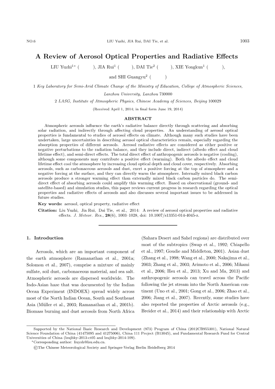 本文综述了气溶胶光学性质及其辐射研究的进展,文章的重点是关于气溶胶光学性质的文献,以及气溶胶主要类型(尘埃、碳质、硫酸盐和海盐)的辐射效应。根据气溶胶光学性质和/或辐射效应的最新文献,先前的研究已被追踪,主要结果也被考虑在内。第2节着重讨论气溶胶光学特性,第3节讨论气溶胶辐射效应,第4节提供了总结和讨论。