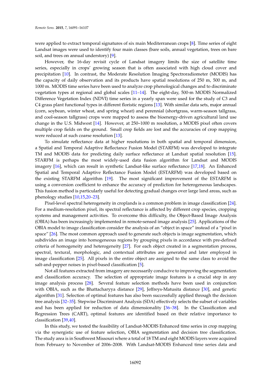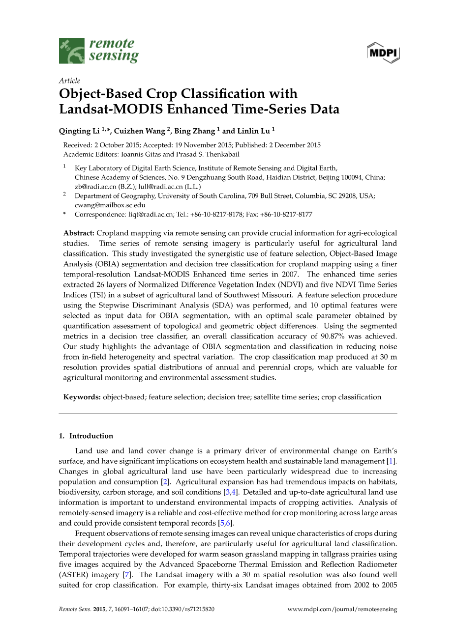 基于Landsat-MODIS增强时间序列数据的基于对象的作物分类外文翻译资料