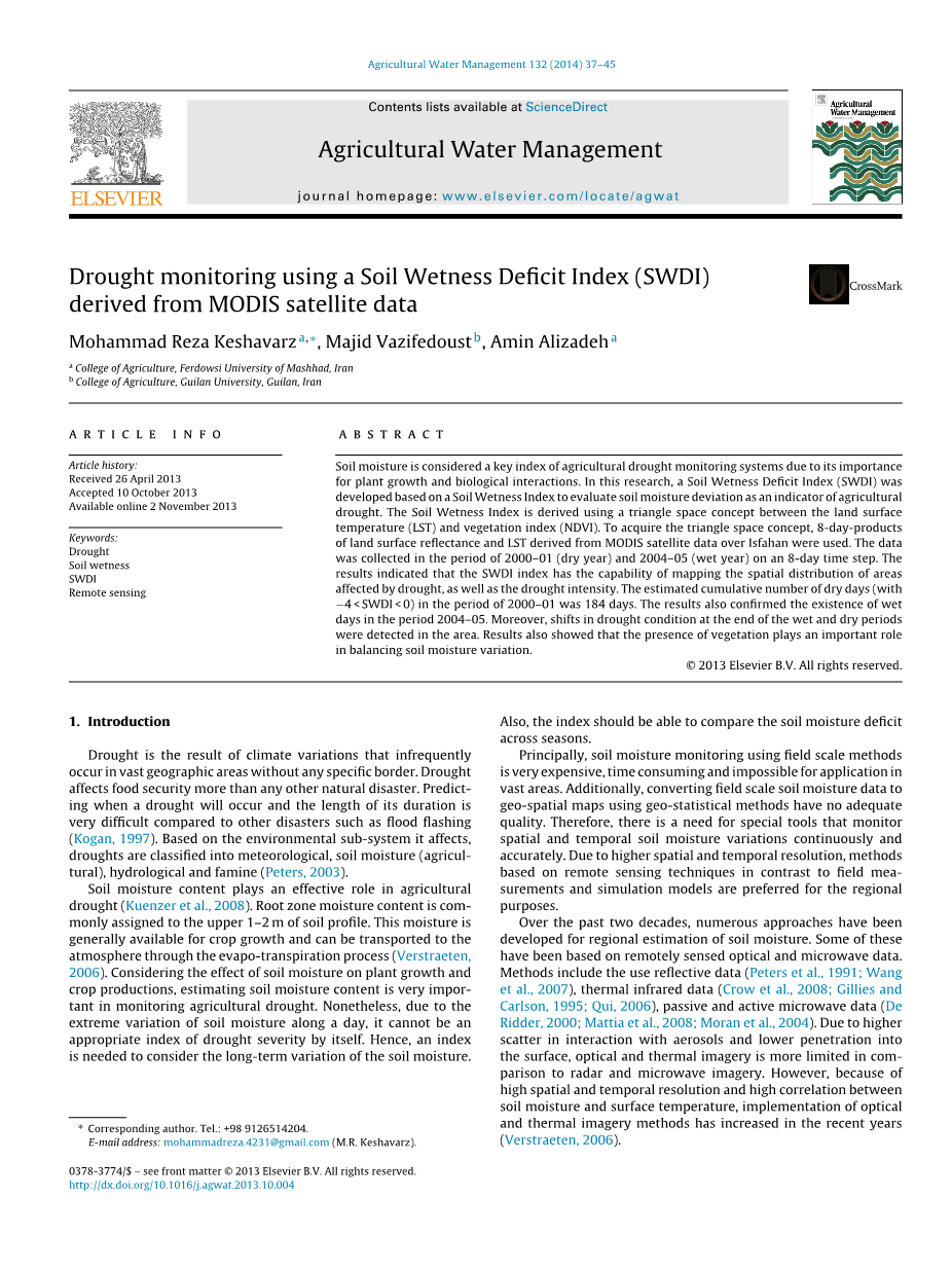 在本研究中。SWDI是基于在LST和NDVI之间应用三角空间理念而获得的土壤湿度指数(SWI),从而通过估算土壤湿度作为评价农业干旱的指标。
