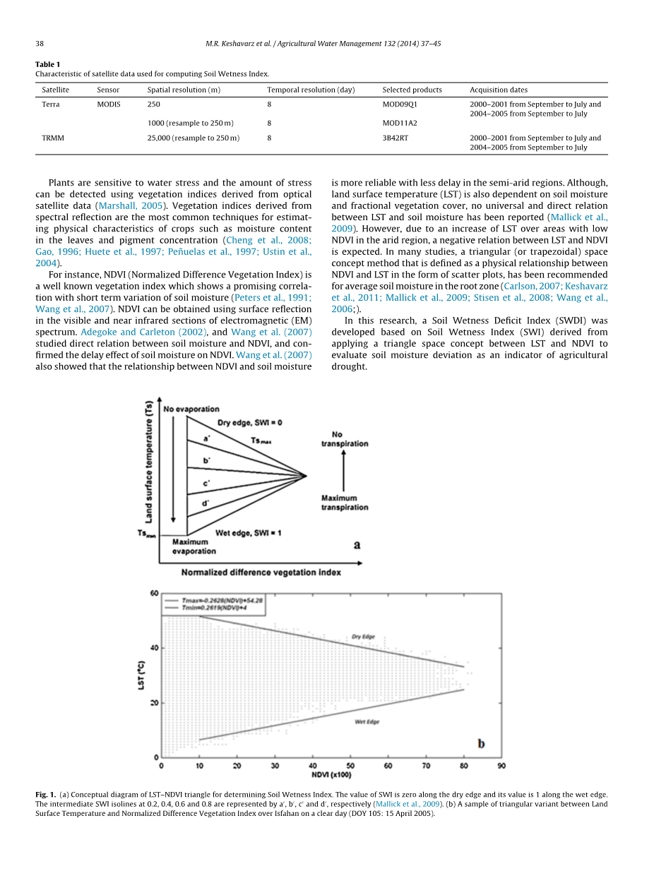 例如,归一化植被指数(NDVI)是众所周知的植被指数,显示了短期内土壤水分变化的相关性。NDVI可以通过近红外和可见光波段的电磁波谱获得。Adegoke、Carleton (2002)和Wang et al.(2007)研究了NDVI和土壤水分的直接关系并且证实了土壤水分对NDVI的延迟影响。Wang et al. (2007)还表明NDVI和土壤水分的关系在半干旱地区延迟小更可靠。虽然,地表温度(LST)也依赖于土壤水分和部分植被覆盖,但是LST和土壤水分没有直接普遍的联系。但是,由于干旱地区植被覆盖低的区域地表温度增高了,预计LST和NDVI之间存在的负相关性。在许多研究中,三角空间理念方法被定义为NDVI和LST之间的用散点图表达的物理联系,被推荐用于估算根区平均土壤水分。