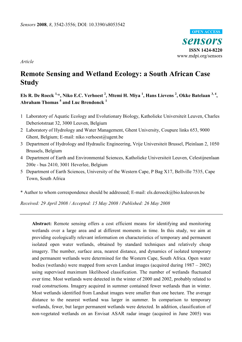 摘要:遥感提供了一种经济高效的方法来识别和监测大面积和不同时刻的湿地。在这项研究中,我们的目的是提供有关的临时和永久孤立的开放水域湿地,通过标准技术和相对便宜的图像特征的生态相关信息。确定了西开普南非临时湿地和永久湿地的数量、表面积、最近距离和动态。利用监督分类中最大似然分类法对七个陆地卫星图像(1987~2002年间获得的)开放水域(湿地)进行了绘制。湿地的数量随着时间的推移而波动。大多数湿地在2000和2002冬季被发现,这可能与道路的建设有关。夏季获得的图像比冬季含有更少的湿地。从Landsat图片中发现的大部分湿地小于一公顷。在夏季,到最近的湿地的平均距离较大。与临时湿地相比,检测到的湿地较少,但规模更大。此外,对Envisat ASAR雷达图像(2005)上的非植被湿地分类进行了评价。由于雷达图像广泛的预处理要求,探测到的小湿地的数量比雷达图像(2002年6月获得)要低,可能是由于空间信息含量的恶化造成的。光学和雷达分类都可以评估潜在影响植物和动物元共生结构的湿地特征。然而,Envisat图像不如Landsat图像适合提取详细的生态信息,因为只有大型湿地才能被检测到。 这项研究表明,尽管地球资源卫星和环境卫星图像的分辨率相对较低,但通过相对便宜的图像和标准技术,可以为较大的湿地生成与生态相关的数据。 对于非常小的湿地的来说,需要高空间分辨率的光学或雷达图像。 这项研究体现了整合遥感和生态学的益处,从而促进了对孤立湿地的跨学科研究。