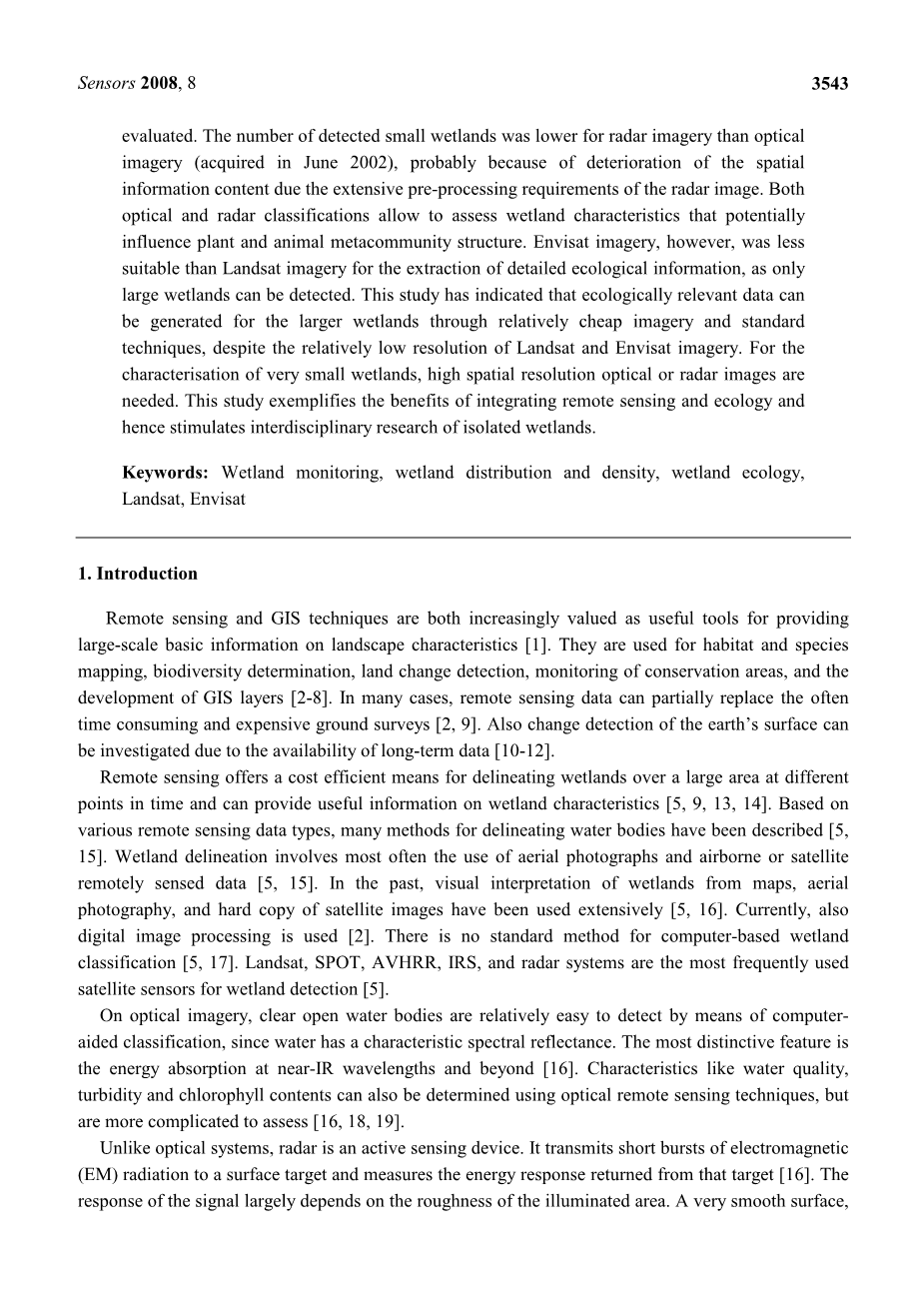 遥感提供了一种有效的方法,可以在不同的时间点对湿地进行划分,并能提供有关湿地特征的有用信息[5,9,13,14]。基于各种遥感数据类型,描述了许多描述水体的方法[5,15]。湿地的划定涉及到最常使用航空照片和机载或卫星遥感数据[5,15]。在过去,从地图、航空摄影和卫星图像的硬拷贝中对湿地的视觉解读得到了广泛的应用[5,16]。目前,还使用数字图像处理[2]。基于计算机的湿地分类没有标准的方法[5,17]。Landsat、SPOT、AVHRR、IRS和radar系统是最常用的用于湿地探测的卫星传感器[5]。
