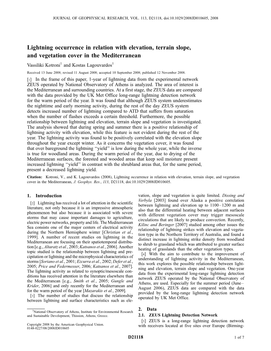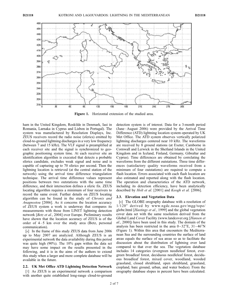 [4]这项工作主要是根据探索闪电和海拔,地形坡度和植被之间的可能关系,来帮助人们提高对地中海闪电活动的认识。数据来源为雅典国家天文台操作实验远距离闪电探测网ZEUS,时长一年。尤其是夏季期间(2006年6- 8月),将ZEUS数据与由英国气象局运营的远距离闪电探测网提供的数据进行了比较。