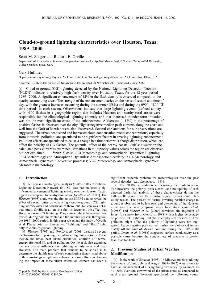 [ 1 ] 1989年至2000年的12年期间,由全国雷电监测网检测雷击网(NLDN)探测到的地闪(CG),其地闪密度相对休斯敦、德克萨斯较高,相比于附近周边地区闪电密度显著增强45%。增强的强度变化取决于季节和时间,最大的增长发生在夏季(58%)并且增强发生在每个季节的9点-18点。观察表明,大型雷击事件(定义为在一个包括休斯敦和附近农村地区的地理区域内,多于100次闪电发生的事件)是表面雷电异常气候的主要原因,但雷暴的最初增加并不是闪电密度增强的最重要原因。根据观察,城市上空的正地闪减少了12%。较高的负中值峰值电流沿海岸到达了墨西哥湾。根据我们的观察有几个解释,有可能是城市热岛和增加的云凝结核浓度,尤其是当地的工业污染,被推断为是造成闪电增强的重要因素,据推测污染的影响引起了雷暴的电荷分布的变化,可以直接影响到地闪的极性。附近沿海湾咸水的检查也在潜在影响着计算峰值电流。整个区域的多样性值的变化被观察但并未进行解释。指数:3324气象学和大气动力学:闪电;3304气象学和大气动力学:大气电学;3314气象学和大气动力学:对流过程;3329气象学和大气动力学:中尺度气象学