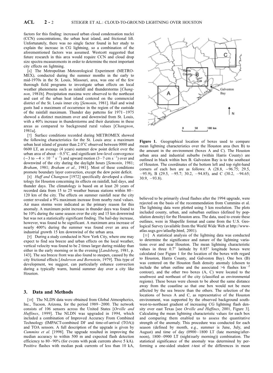 一组来自国家闪电探测网(NLDN)的1989-2000年12年间的气候分析数据明显表明休斯敦德克萨斯以及附近的农村地区上空的闪电活动增强[奥维尔等人,2001 ]。 韦斯科特[ 1995 ]首次使用NLDN数据来研究表明增强的地闪闪电活动对几个城市的影响,但休斯敦不在这项研究中。奥维尔等人最先用文献研究说明休斯敦对CG闪电活动的影响。他们的研究结果表明,闪电活动在1989-2000,尤其是冬季和夏季增强明显。在本文中,我们扩展了奥维尔等人的研究。请注意,以下简称“lightning”和“flash”仅指云对地闪电也就是地闪。