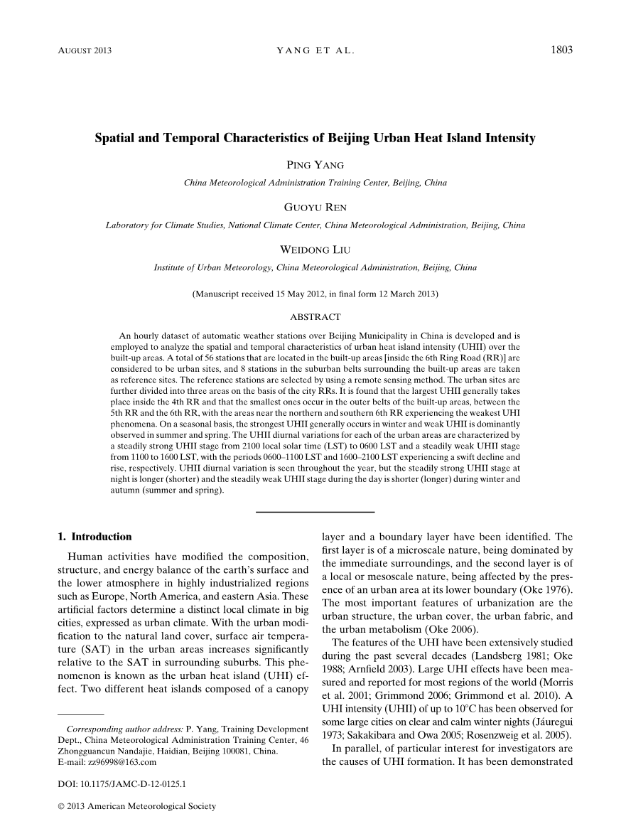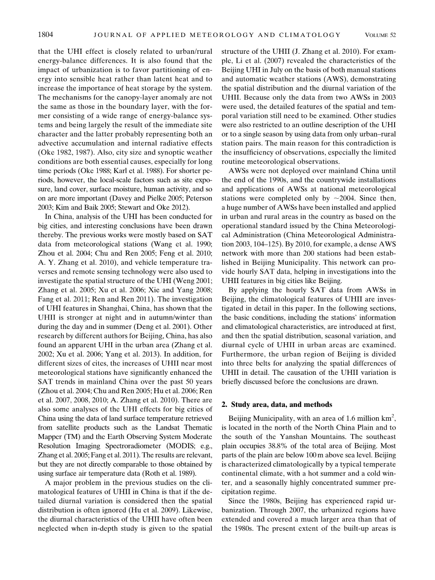 中国热岛时空特征在以前研究学习中,在气象特征上一个主要的问题是详细的日变化但却经常忽略空间分布(Hu et al. 2009)。同样的,UHII的昼夜特征的深入研究,研究空间时却忽视UHII的结构 (J. Zhang et al. 2010)。像2007年李等研究北京7月热岛的基础上手动站和自动气象站显示的特点(AWS),显示UHII的空间分布和日变化。在2003年,因为只使用了两个AWS的数据,详细的功能空间和暂时的变化仍然需要调查。其它的研究也仅限于热岛的描述,或者只通过使用从一对城乡站的一个季节数据。这一矛盾的主要原因是观察的不足,尤其是有限的常规气象观测。