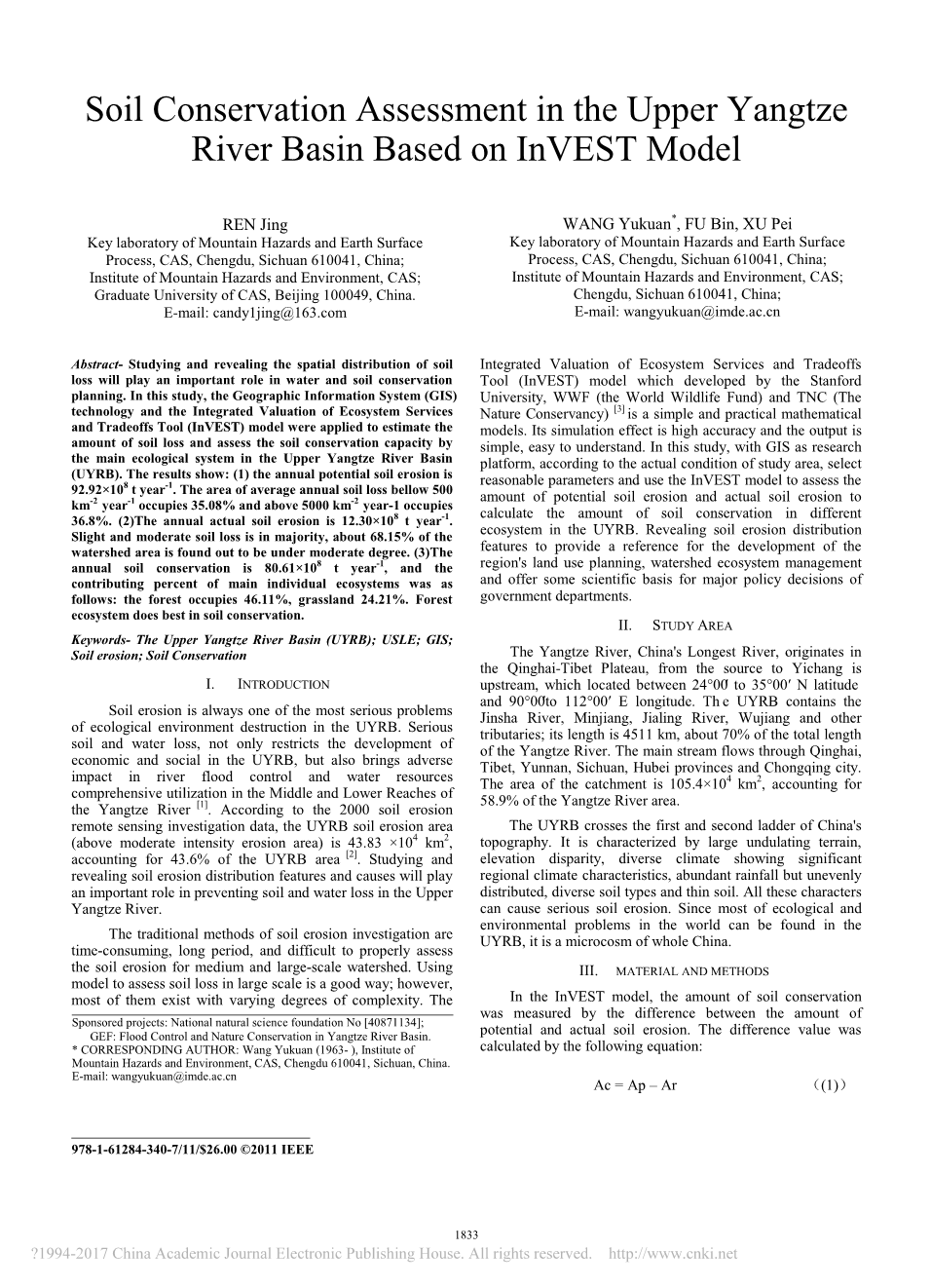 关键词:长江上游(UYRB),USLE,GIS,水土流失,土壤保护