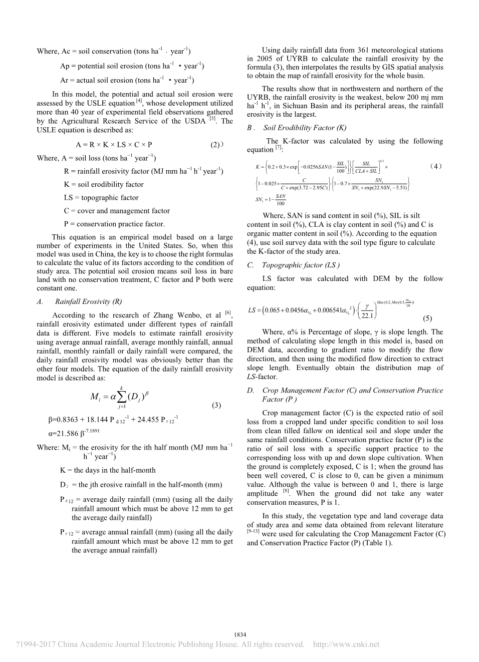 在该模型中,USLE方程[4]评估了潜在和实际的水土流失,其发展利用了美国农业部农业研究局收集的实验现场观察40多年的数据。 USLE方程描述为: