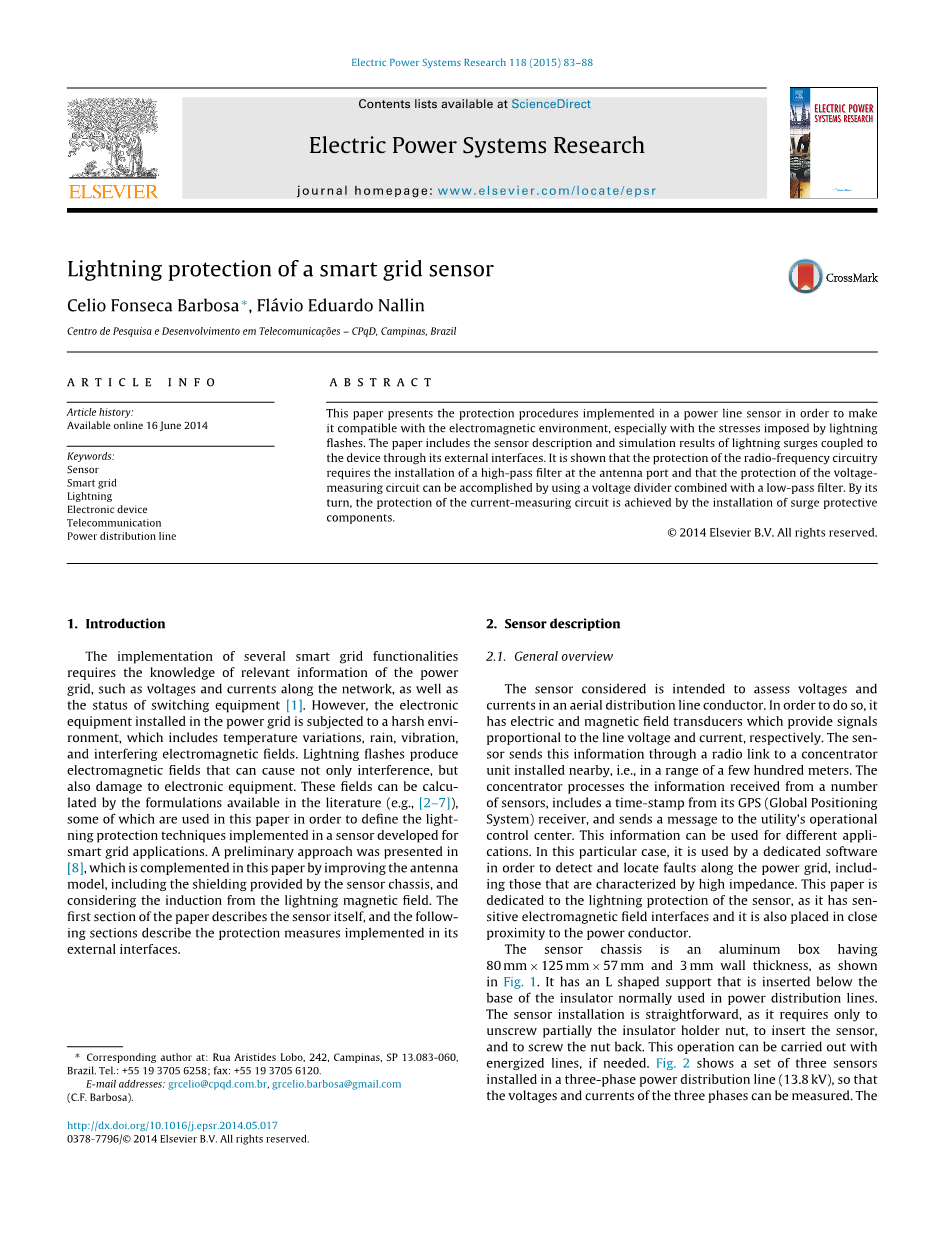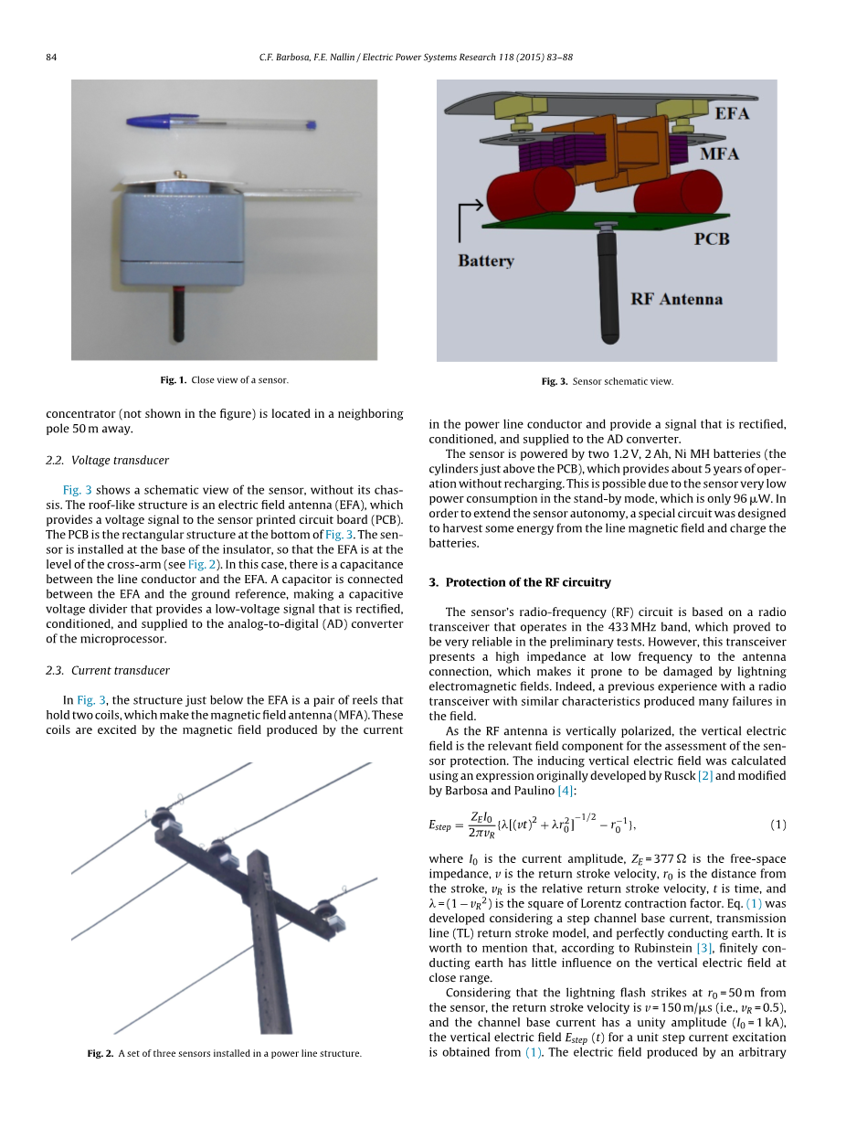 所考虑的传感器的目的是评估电压和架空配电线路导线中的电流。这样做的原因是:提供信号的电场和磁场传感器线电压和电流成正比。该传感器通过无线电路发送此信息到一个选矿厂单位附近,即在几百米的范围内。这个选矿厂从一个数字传感器处理收到的信息,包括一个时间戳,其全球定位系统(全球定位系统)接收器,并向该实用程序的操作控制中心发送一个消息。此信息可用于不同的应用程序。在这种特殊情况下,它是由一个专门的软件使用为了检测和定位故障沿电网,包括那些具有高阻抗的特点的电网。本文是专用于传感器的防雷,因为它具有敏感的电磁场接口,它也被放置在靠近电力导体的位置。该传感器机箱是一个铝框有80毫米times;125毫米times;毫米times;57毫米,壁厚3毫米,如图所示在(图1)它有一个升形的支持,用绝缘子的基础插入下面的配电线路。传感器的安装很简单,因为它只需要拧下绝缘支架螺母,插入传感器,并将螺母拧紧。如果需要的话此操作可进行通电线路。图2显示了一组三个传感器安装在三相配电线路(13.8伏),所以可以测量的电压和电流的三个阶段。这个聚光(未显示在图中)位于邻近极50米远。
