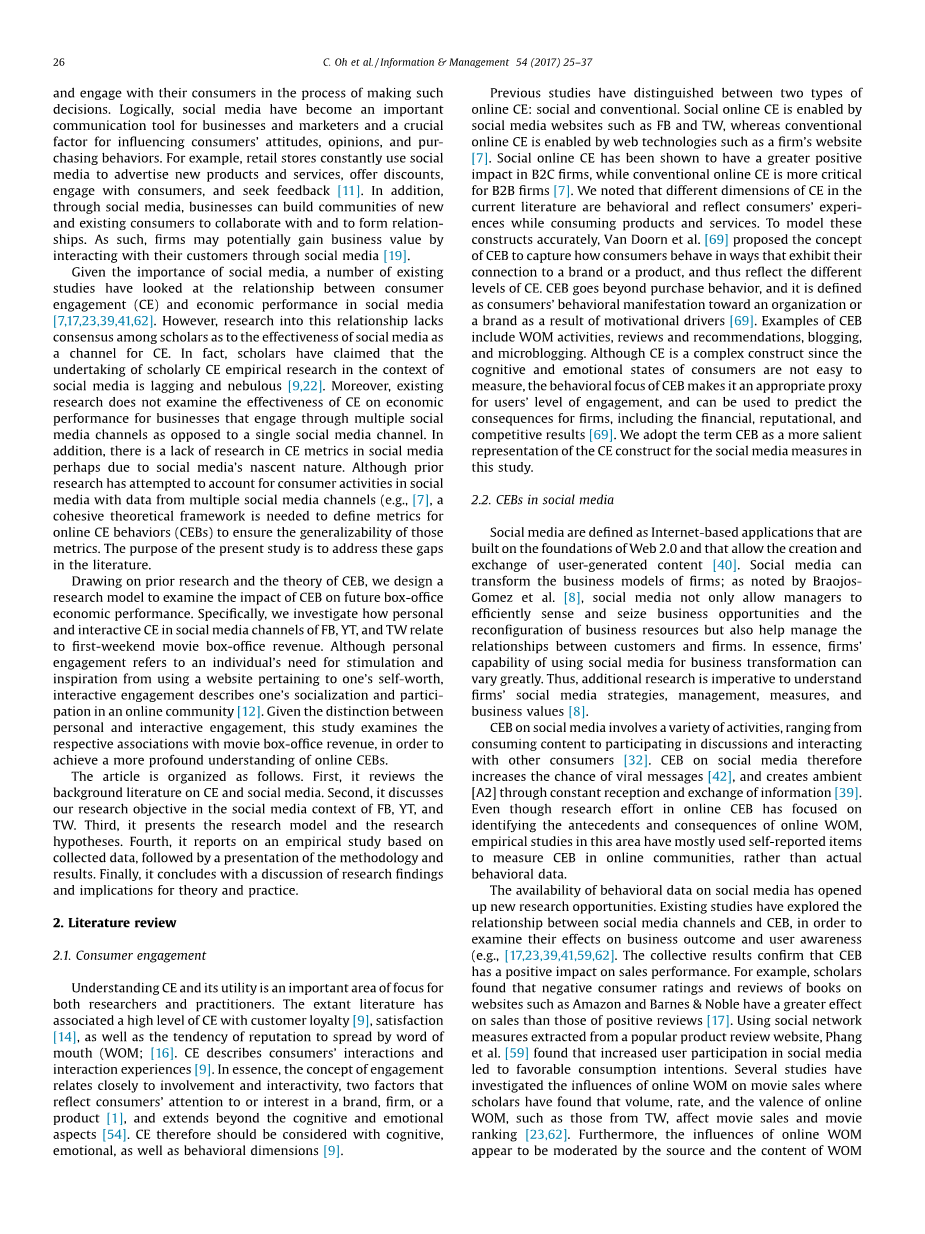Given the importance of social media, a number of existing studies have looked at the relationship between consumer engagement (CE) and economic performance in social media [7,17,23,39,41,62]. However, research into this relationship lacks consensus among scholars as to the effectiveness of social media as a channel for CE. In