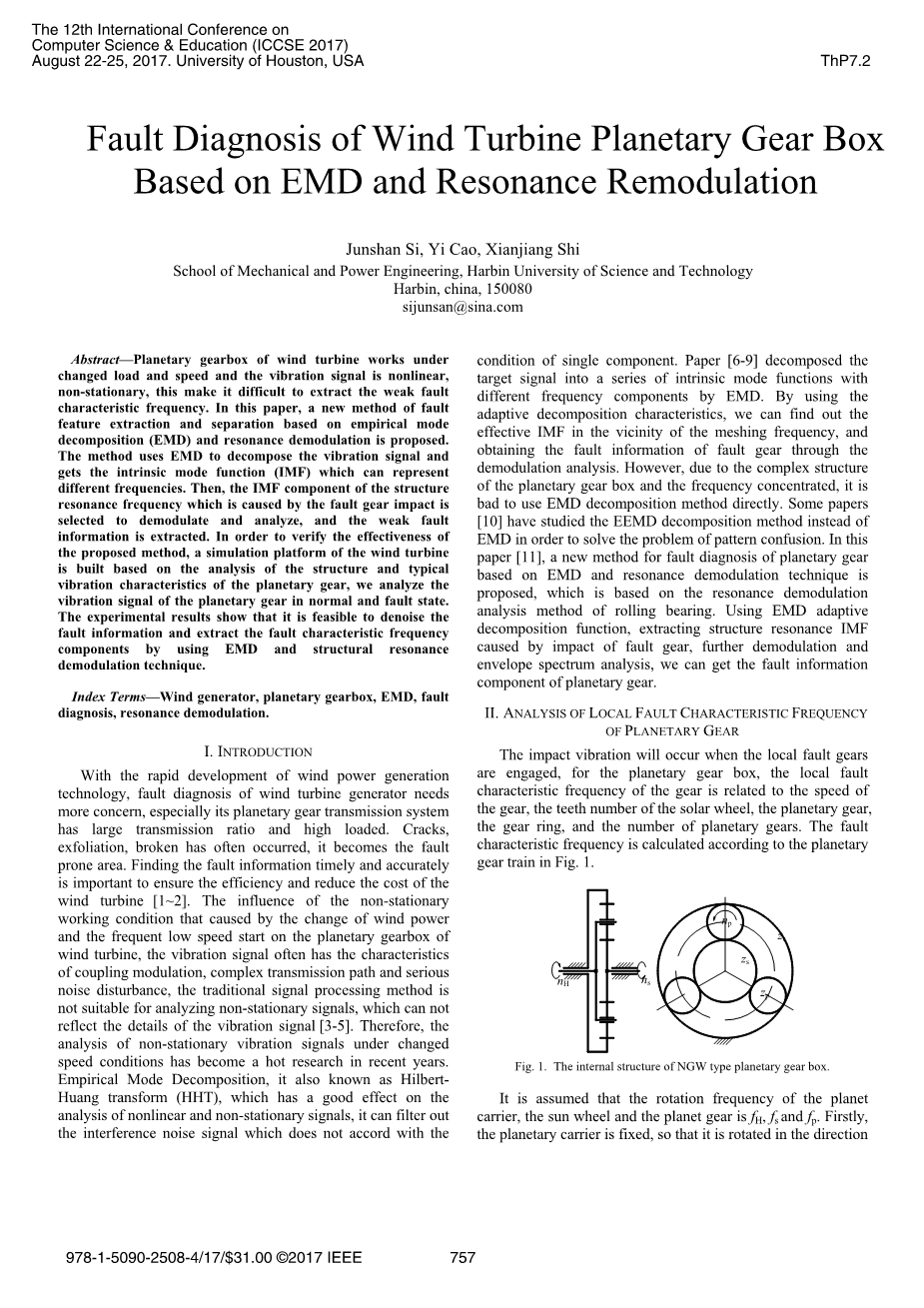 基于EMD和共振调制的风电行星齿轮箱故障诊断外文翻译资料