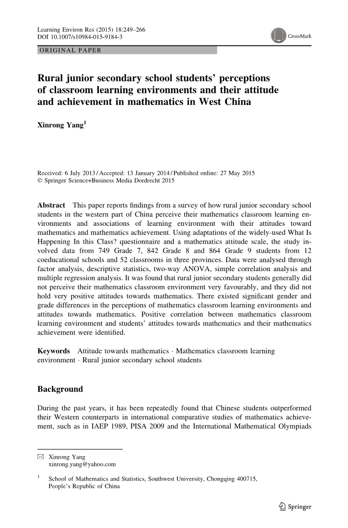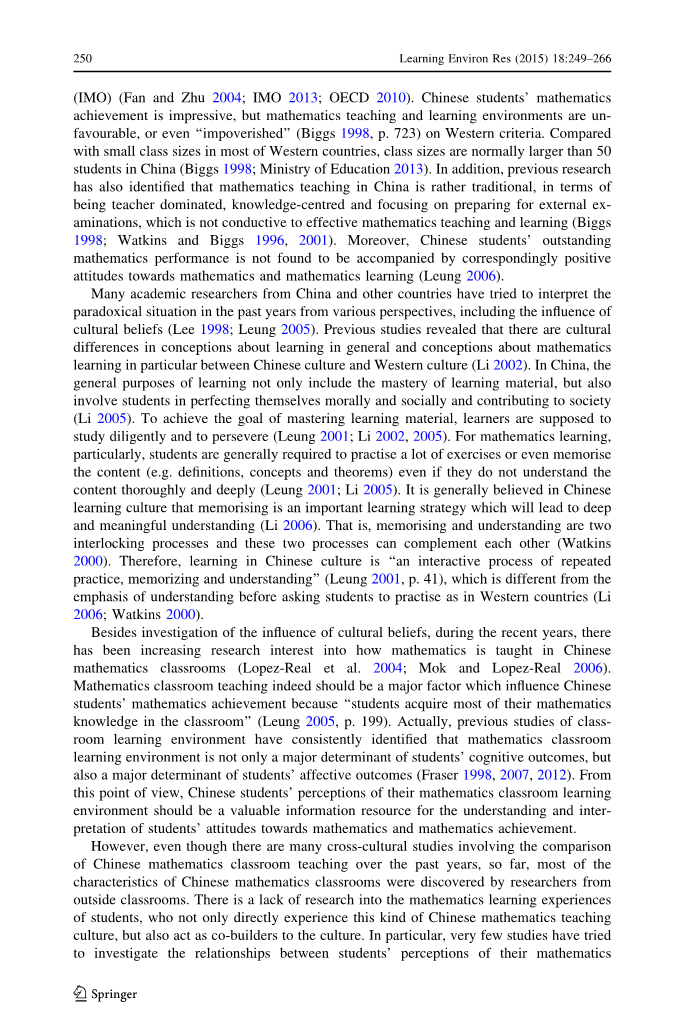 过去数年,已经重复的发现中国学生在国际数学成就比较研究(例如 iaep 1989、 pisa 2009及国际数学奥林匹克(imo))中的成绩屡次超过西方学生(fan和zhu,2004; imo 2013; oecd 2010)。 中国学生的数学成就令人印象深刻,但数学教学环境不利,甚至按照西方标准是“贫困”(biggs 1998,p. 723)。 与大多数西方国家的小班规模相比,中国的班级规模通常大于50人(biggs 1998; 教育部2013)。 此外,以往的研究也发现,中国的数学教学相当传统,教师主导型、知识中心型、注重外部考试准备,不利于有效的数学教与学(biggs1998; watkins amp; biggs 1996,2001)。 此外,中国学生的优秀数学成绩并没有伴随相应对待数学和数学学习的积极态度(梁2006)。