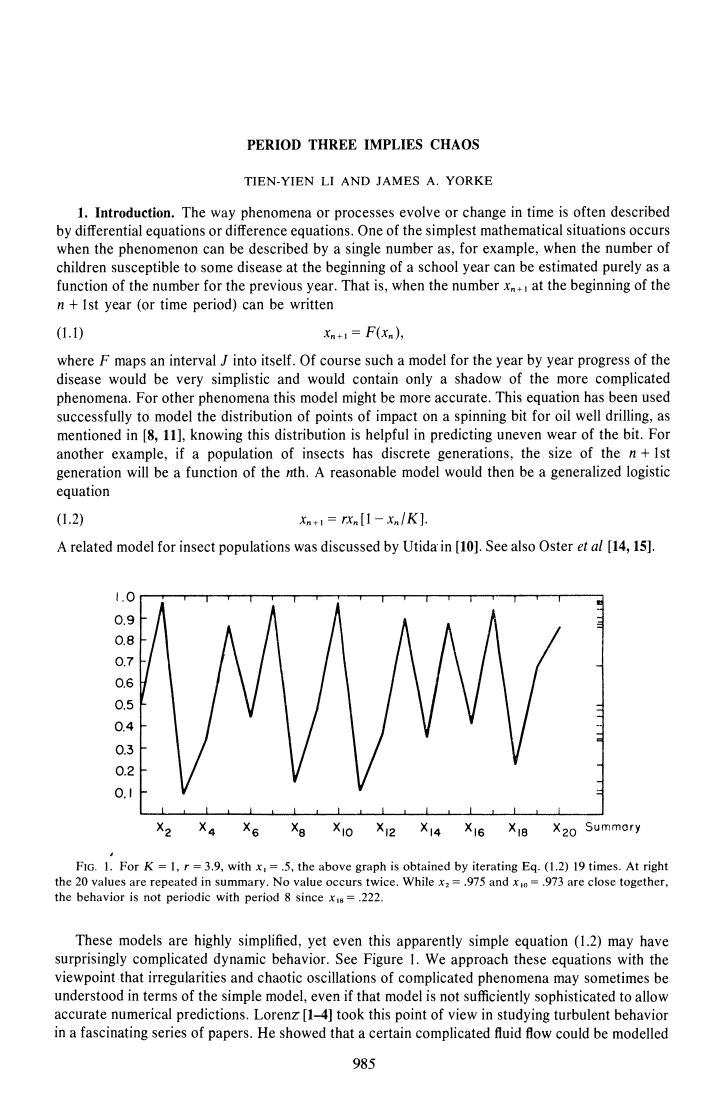 这些模型是高度简化的,但即使是这个看似简单的方程(1.2)也可能具有令人惊讶的复杂动态行为,见图1。我们以这样的观点来处理这些方程,即复杂现象的不规则和混沌振荡有时可以用简单模型来理解,即使该模型不够复杂,无法进行精确的数值预测。Lorenz[1-4]在一系列论文中,从这个角度来研究湍流行为。他表明,可以模拟出某种复杂的流体流动。通过这样的序列,(),()...保留了原始流的一些混乱的方面。见图2。在本文中,我们分析了序列{()}是非周期的,可能被称为“混乱”的情况。定理I表明,(1.1.)的混乱行为将导致任何一种情况,在这种情况下,大小为的“种群”可以连续两代或更多代地增长,然后达到不可持续的高度,随后就会出现种群崩溃到级或以下。