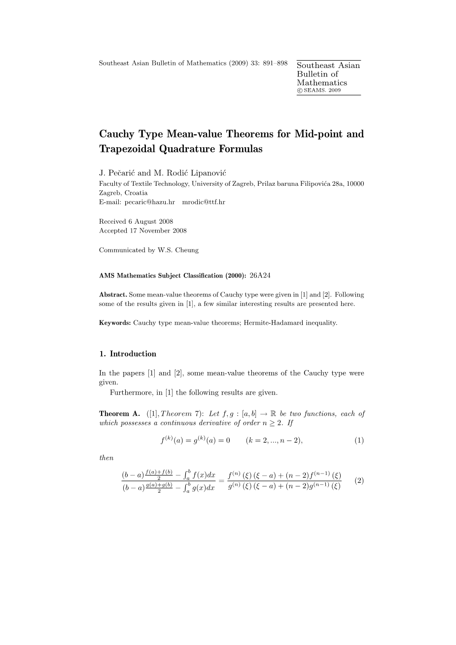 [2] J.E. Pečarić, M. Rodić Lipanović, H.M. Srivastava, Some mean-value theorems of
